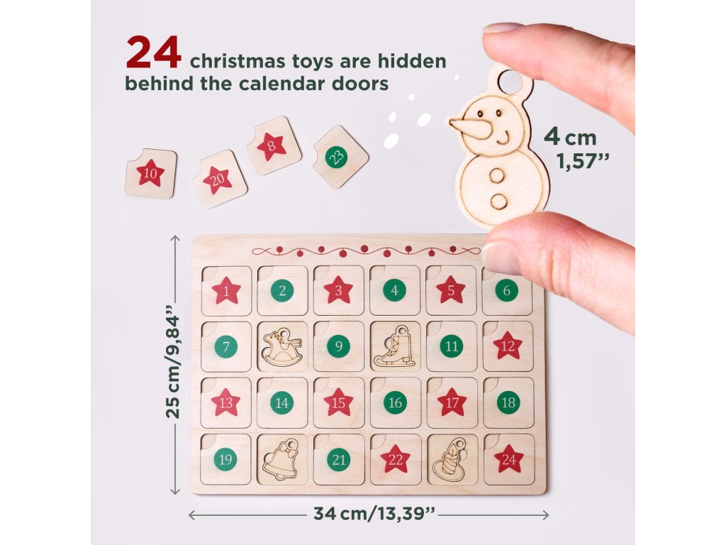 Öffnen Sie jeden Tag ein Fenster und finden Sie darin ein kleines Holzornament. Der Kalender enthält 24 Weihnachtsbaumornamente, die Sie nach Belieben bemalen und verzieren können.