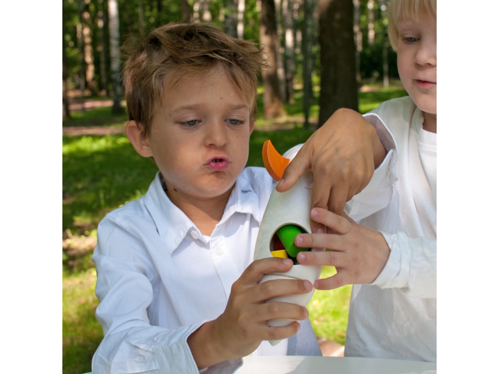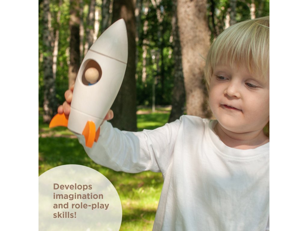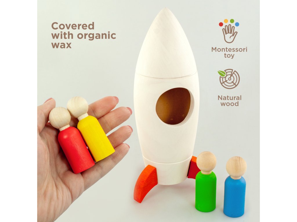 Die Rakete öffnet sich. Das Kind kann es ganz einfach selbst öffnen und einen Astronauten ins All schicken, außerdem stärkt es sein Wissen über die Grundfarben Rot, Blau, Gelb, Grün.