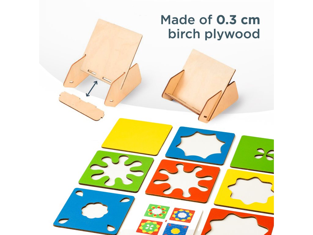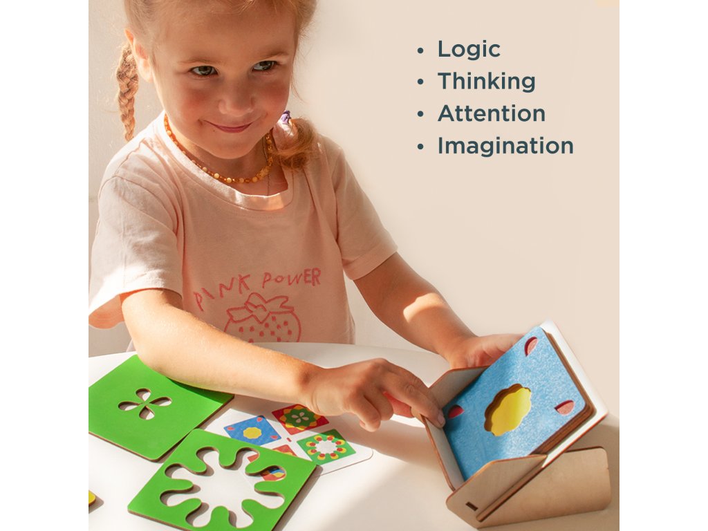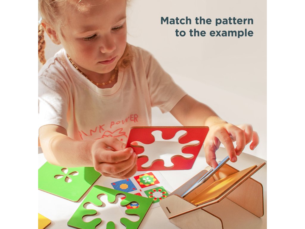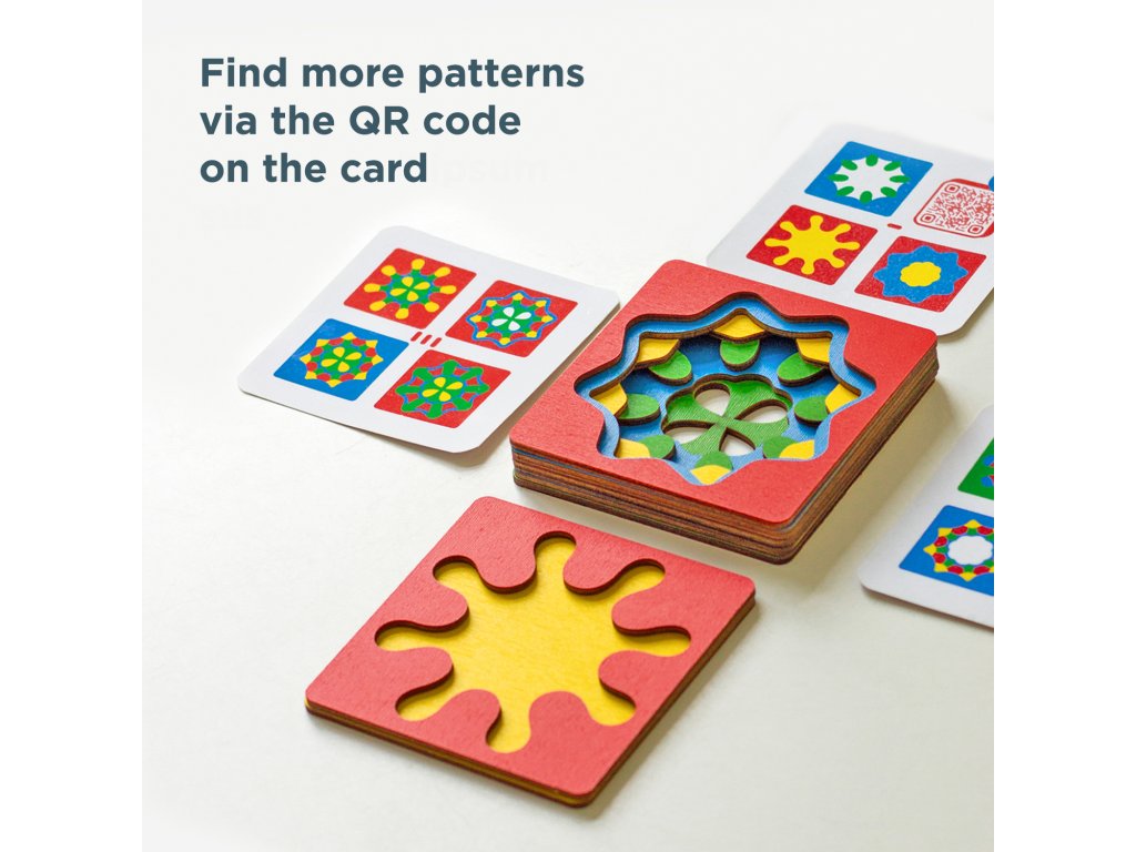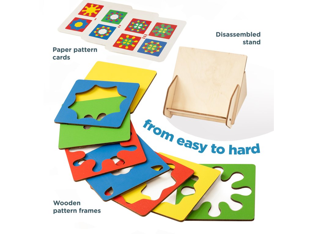 Der Spielablauf ist spannend: Wählen Sie eine Aufgabenkarte aus und legen Sie die Rahmen mit verschiedenen Mustern so übereinander, dass das gezeigte Bild genau nachgebildet wird. Fördert: