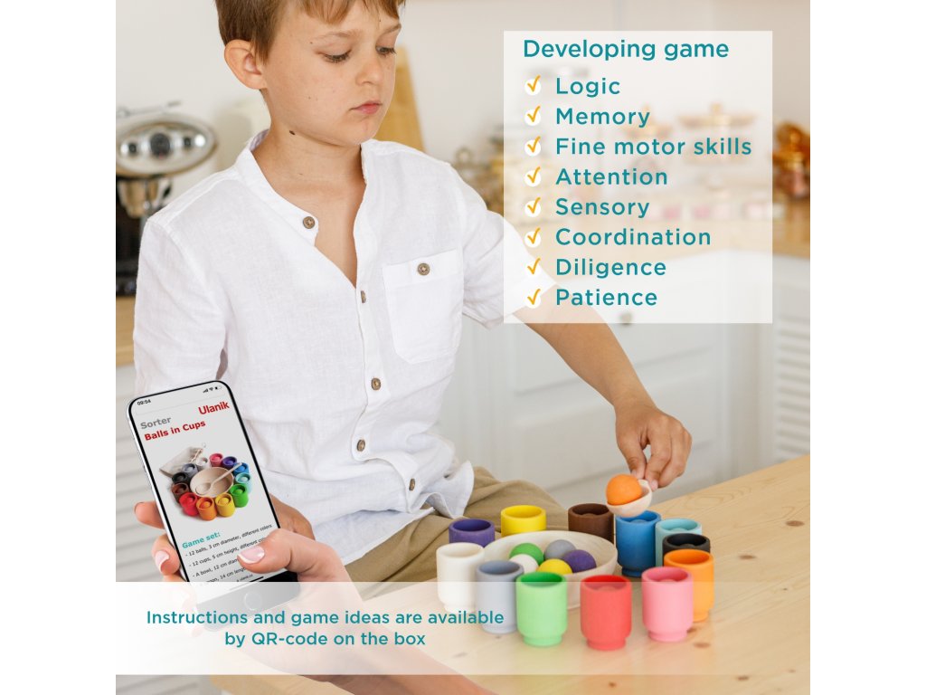 Das Set fördert die Entwicklung der Farbwahrnehmung und -analyse, der Bewegungskoordination, des Fleißes, der Aufmerksamkeit, der Tastsensibilität und der Feinmotorik.