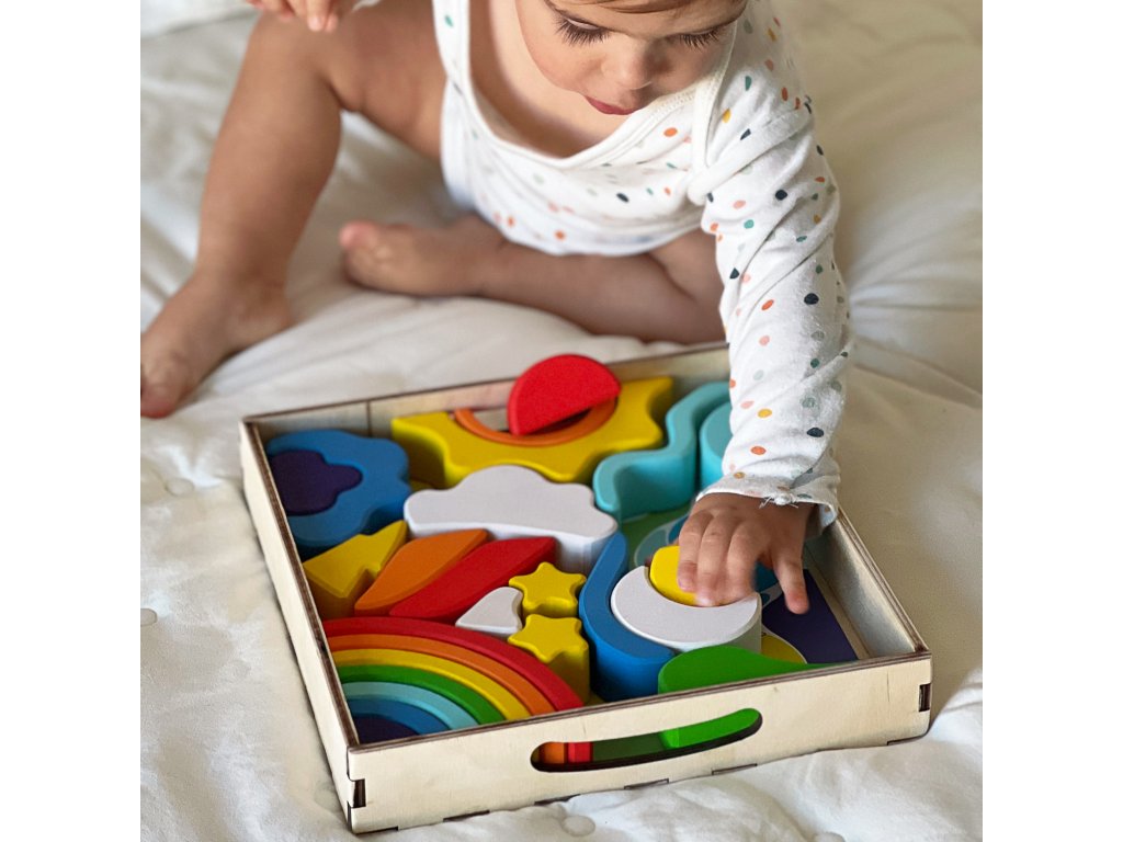 Mozaika se skládá z 31 dílků různých velikostí, tvarů a barev + dřevěný tác. Z nich můžete rozložit krásné kompozice a báječné vzory, stavět scenérie pro hry nebo vyzdobit dětský pokoj.