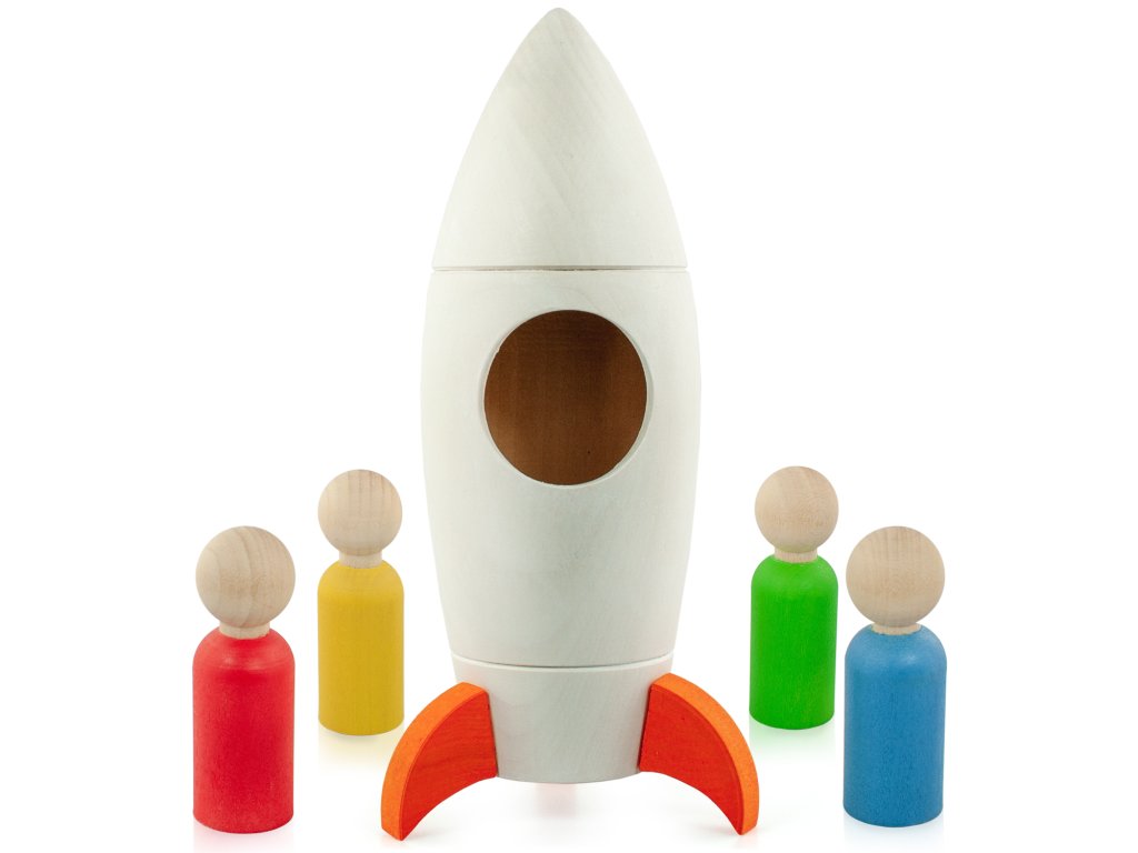 Raketa a figurky jsou vyrobeny z lipového dřeva. Příjemné na dotek, dobře leštěné. Barevné prvky jsou natřeny německým přírodním voskem BIOFA certifikovaným pro dětské hračky. Pozor: prvky natřené přírodním voskem se nedoporučují mýt - k jemnému otření dílů je lepší použít suchý nebo mírně navlhčený hadřík.