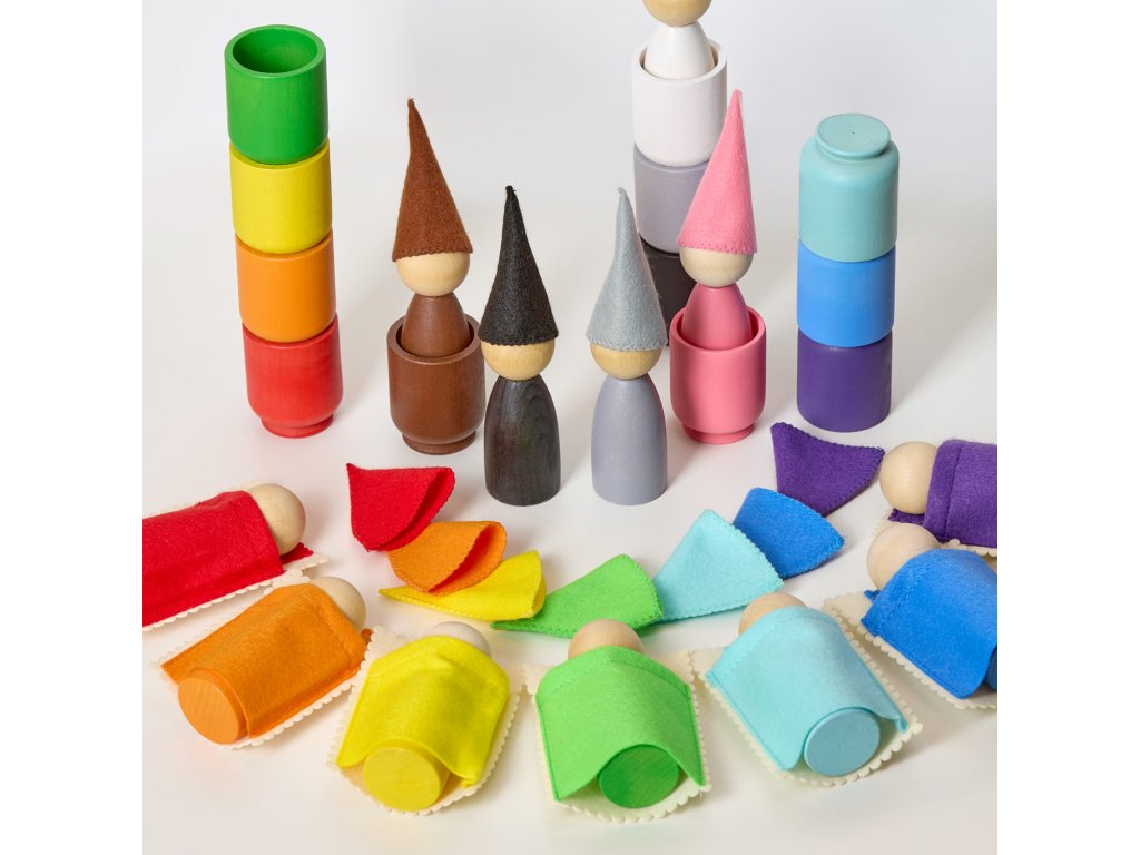 - Includes 12 wooden gnomes, 12 wooden cups, 12 felt beds, 12 felt hats, and a plywood tray to help to keep everything in order.