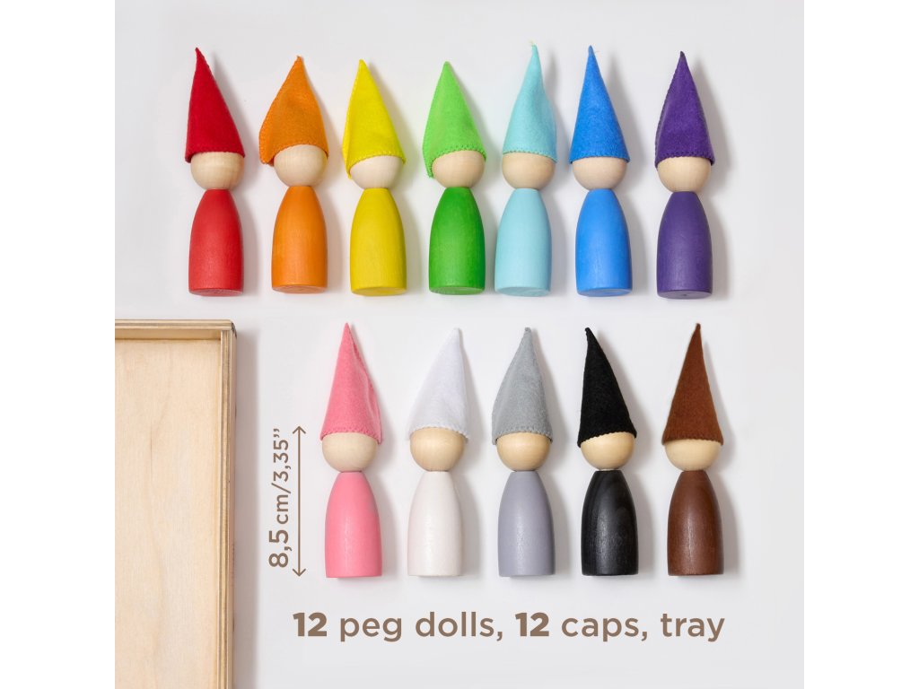 - Includes 12 wooden gnomes, 12 felt hats, and a plywood tray to help to keep everything in order