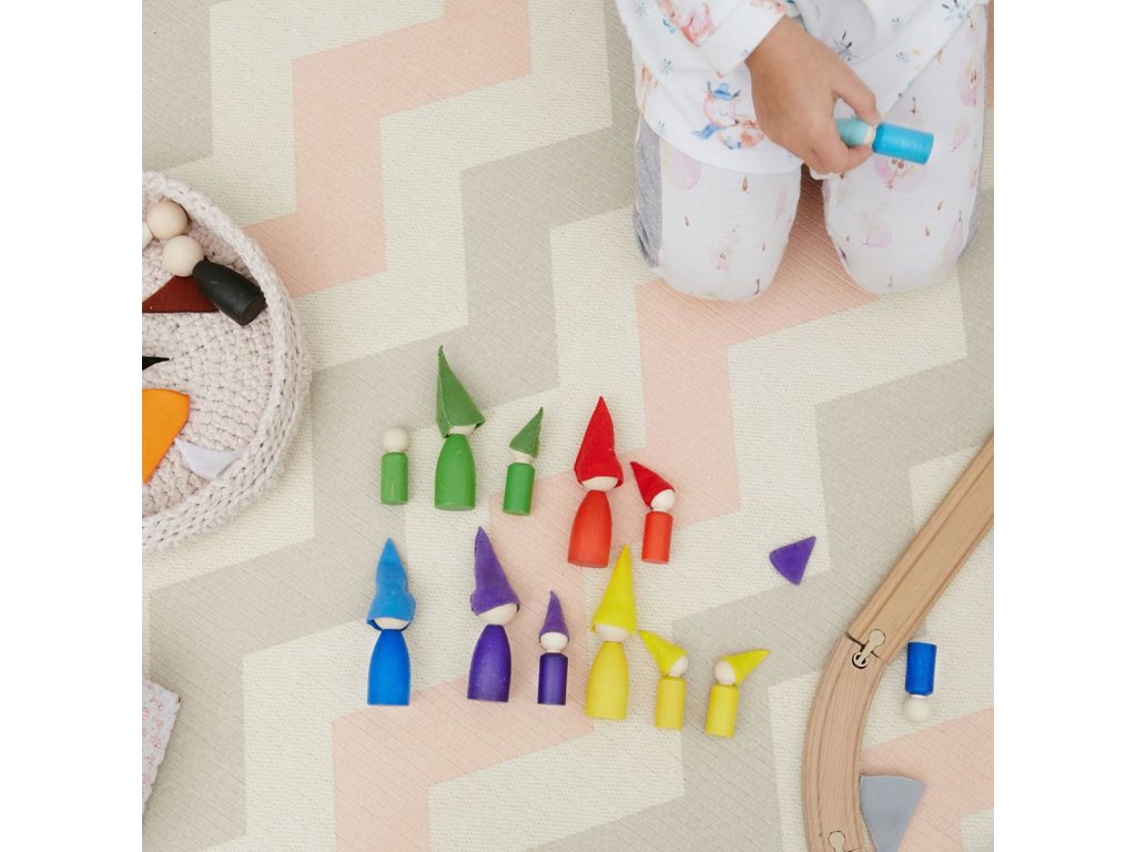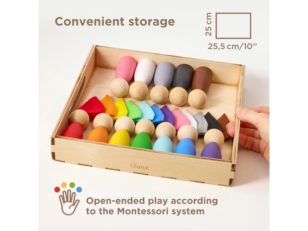 Materials: The peg dolls are made of solid linden wood, covered with BIOFA wax, which includes components of natural origin only. Please note that the natural wax is a delicate cover, so it is not advised to wash it — it's better to use a dry cloth to gently wipe the details. The wax cover is eco-friendly, non-allergic, and safe even for the smallest children. For the soft parts of the sorters, we use hypoallergenic felt. The tray for storage is made of birch plywood.