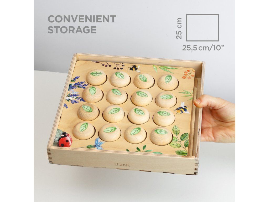 Board game for kids, each chip 4x4 cm and boards with paired images for the game to strengthen memory. Drawing-woodblock printing. The number of replaceable wooden boards in the set - 4 pieces. Wooden tray packing parts.