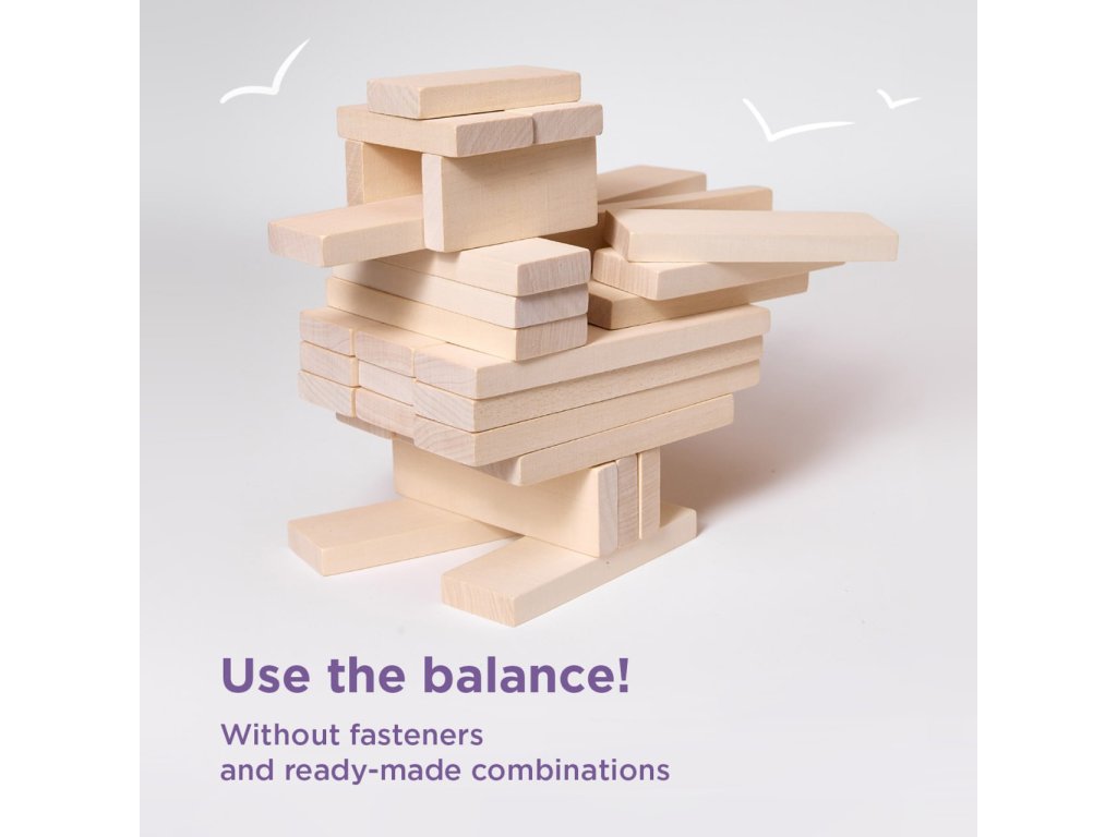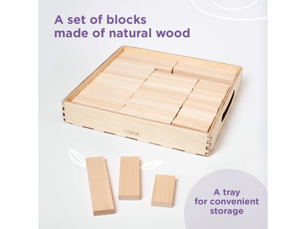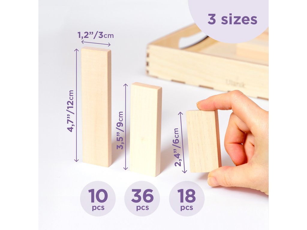 Contents: 10 blocks measuring 12x3 cm, 36 blocks measuring 9x3 cm, 18 blocks measuring 3x3 cm, wooden tray for storage.