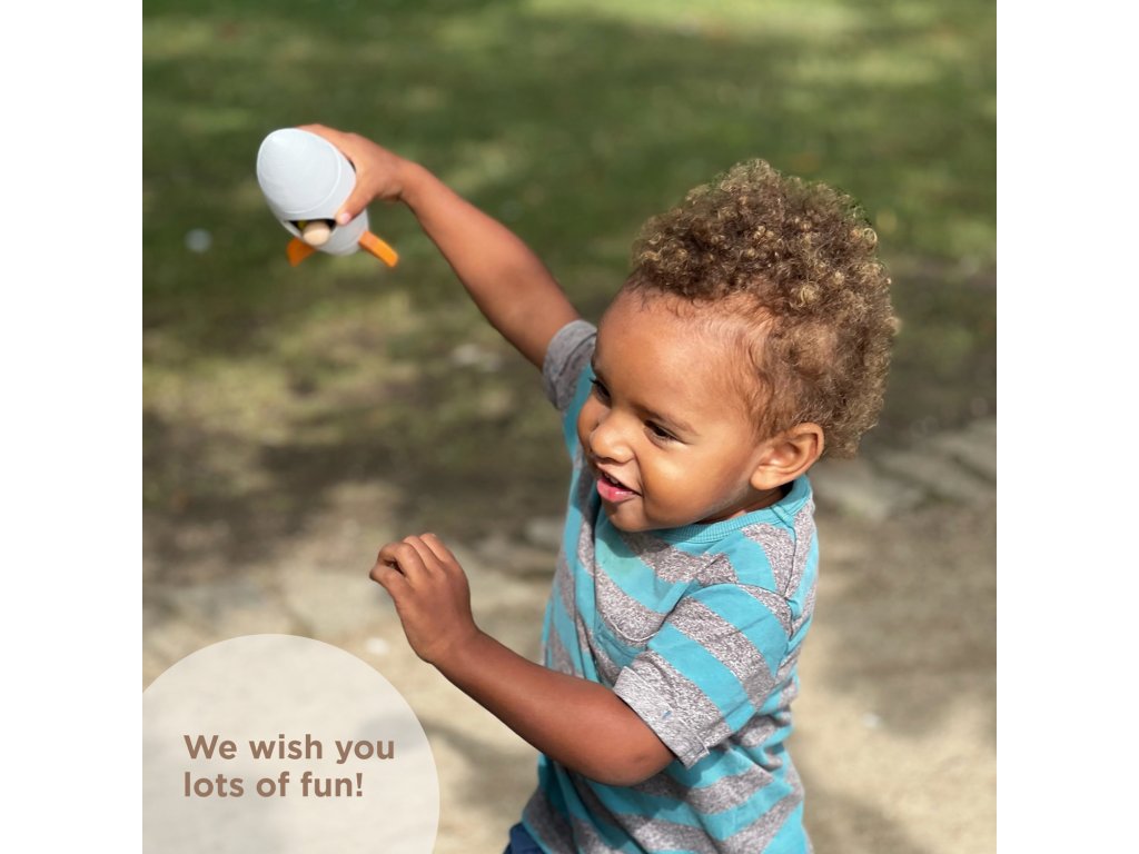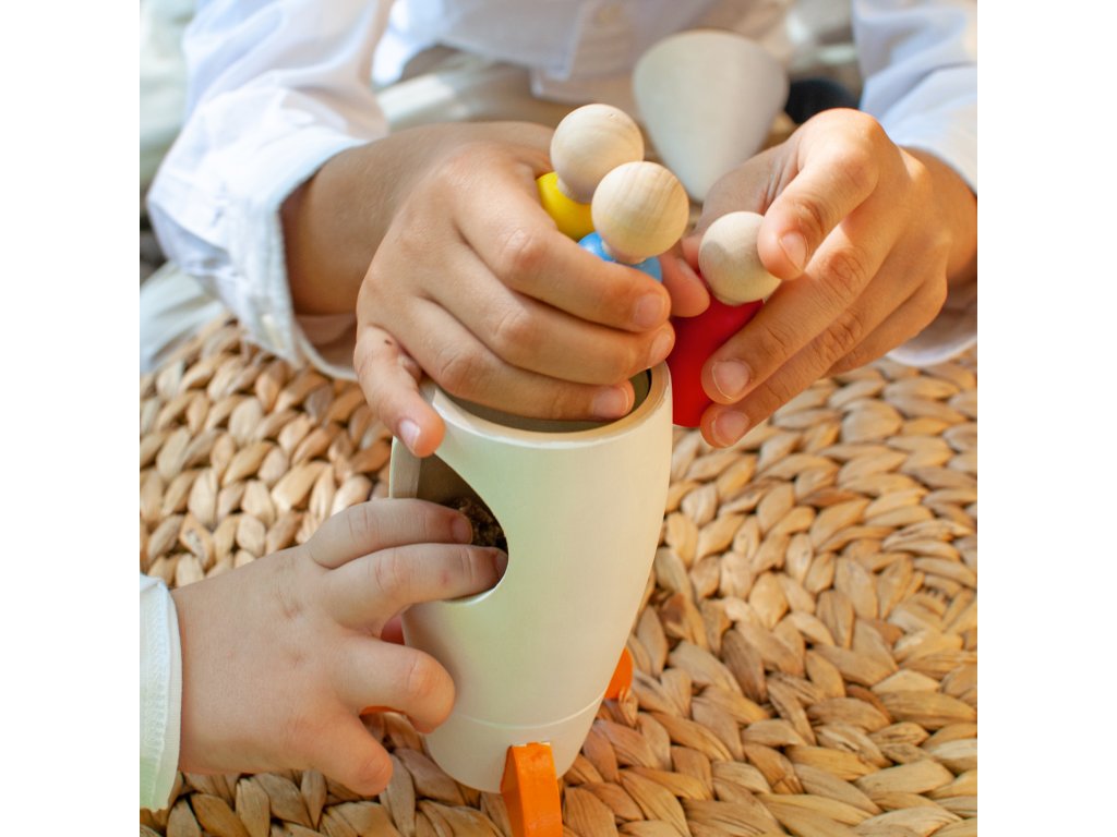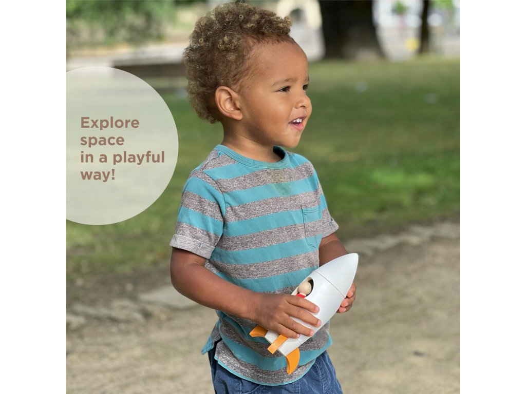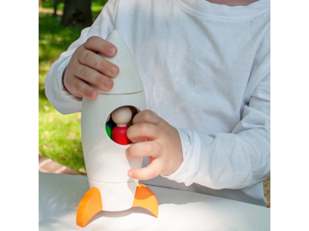 Materials: The rocket and figures are made of lime wood and well polished. Coloured elements are painted with German natural wax BIOFA certified for children's toys.