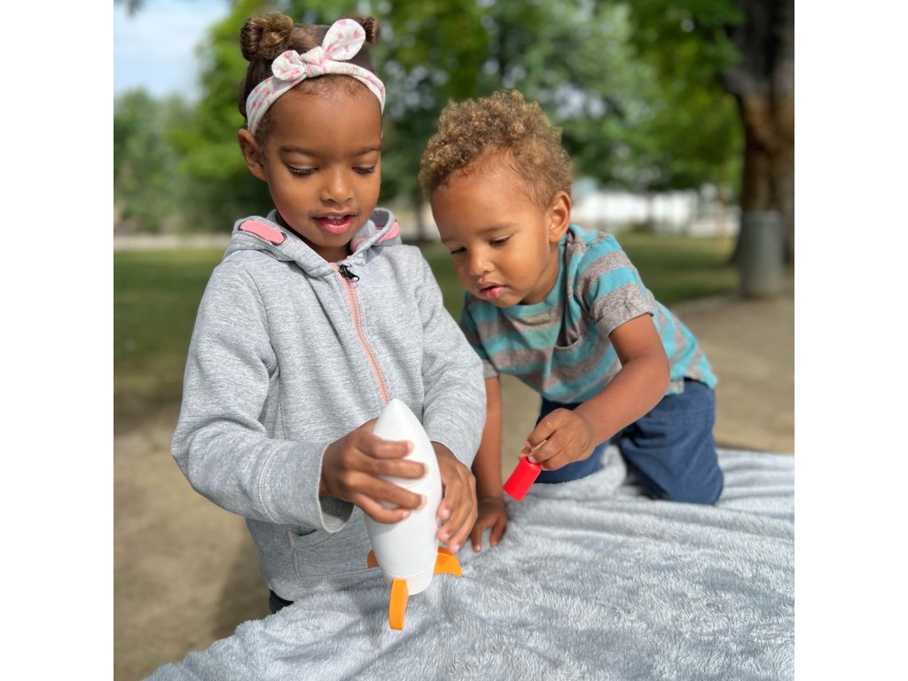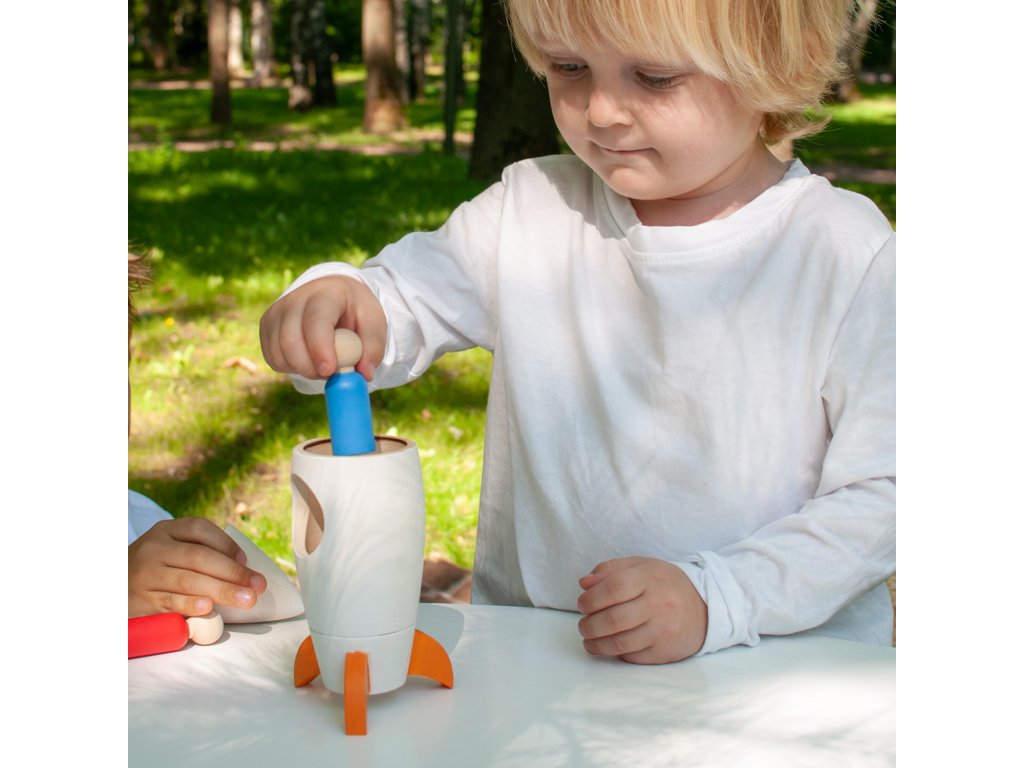 The rocket can be opened. A child can easily open it and send an astronaut into space, and in addition, they will reinforce their knowledge of basic colours: red, blue, yellow, green.