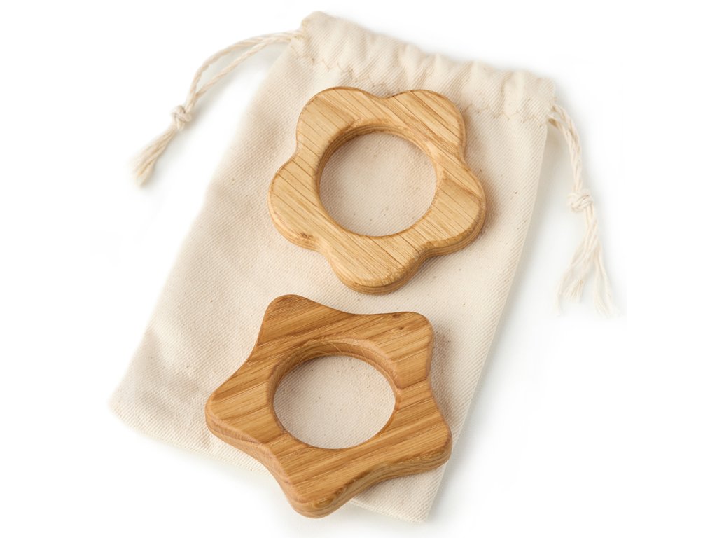 Dřevěná kousátka – hračky pro miminka od prvních měsíců života. Jsou vyrobená z buku, což zajišťuje bezpečnost pro dítě. Balení obsahuje dvě kousátka různých tvarů, což podporuje rozvoj taktilních vjemů a jemné motoriky. Rozměry: 6,5 cm a 7,3 cm, vnitřní průměr 3,5 cm. Lehká váha.