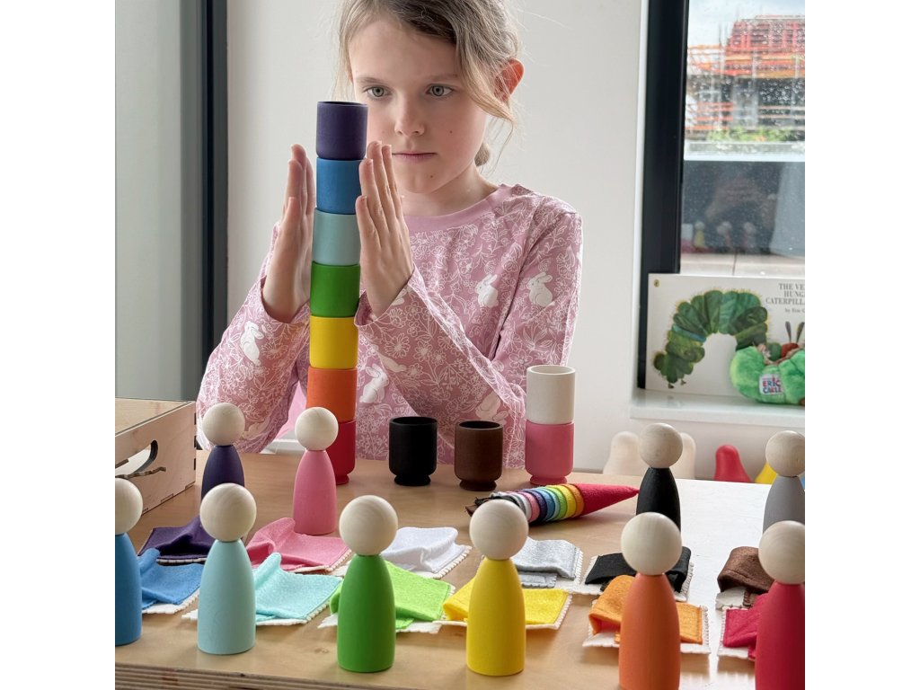 Montessori dřevěná hračka "Panenky na kolíčkách s klobouky, postýlkami a hrníčky"