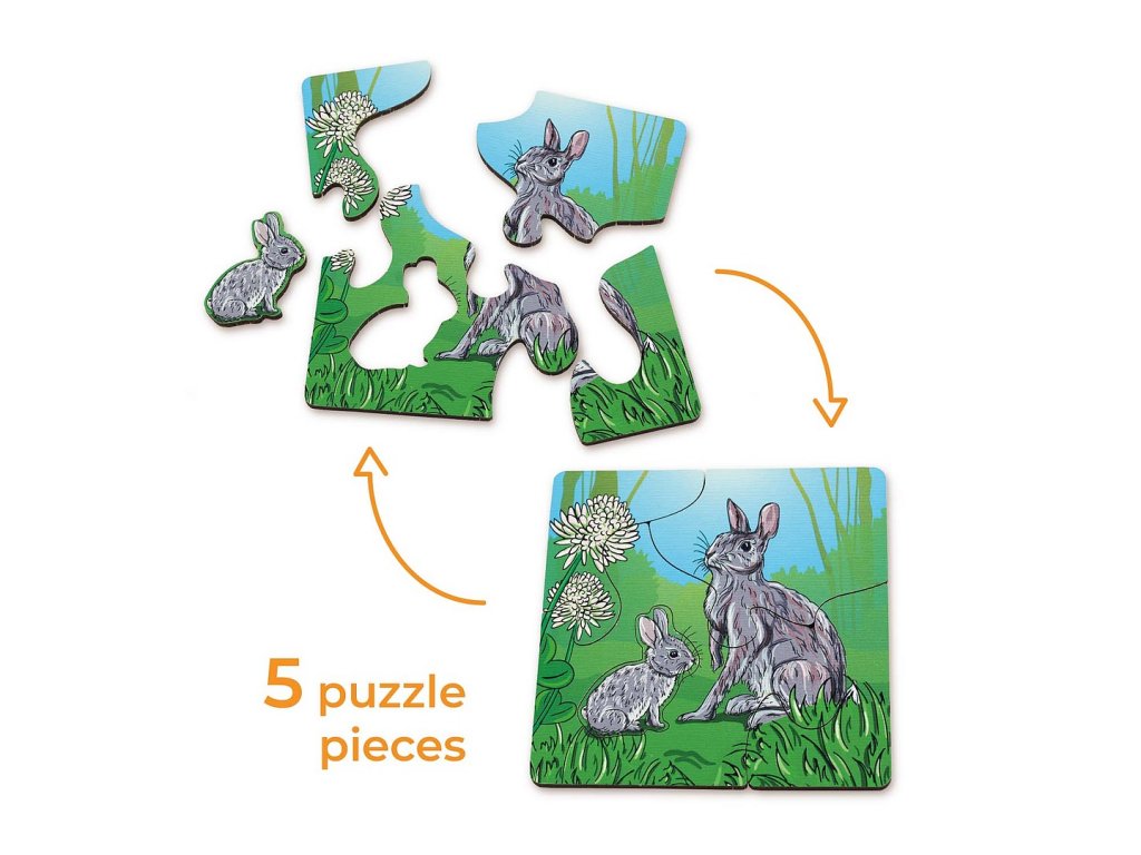 Složení: obsahuje 4 puzzle: rodinka zajíců - 5 dílků, rodinka želv - 6 dílků, rodinka papoušků - 4 dílky, rodinka ryb - 3 dílky.