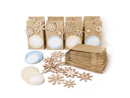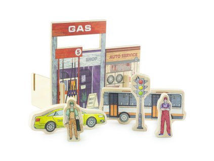 Složení: 77 dílů, z toho 8 desek 12x3 cm, 8 desek 9x3 cm, 8 desek 6x3 cm, 8 oblouků 9x3x3 cm, 7 latí 6x3x3 cm, 7 kostek 6x3x3 cm, 14 kostek 3x3x3 cm, 7 panenek 26x3 cm, , 8 trojúhelníků 4x2 cm; dřevěný tác.