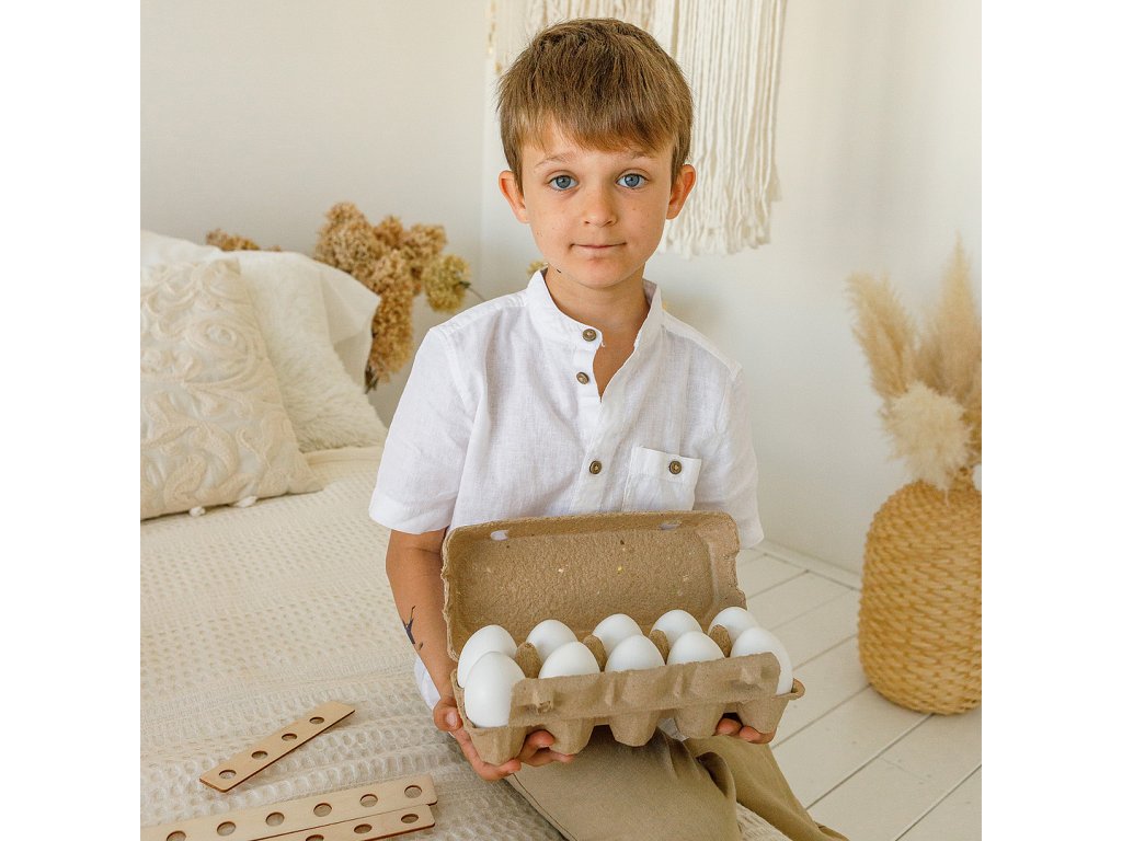 Sada 10 kusů dřevěných vajíček zabalených v kartonové krabici, díky které sada na první pohled vypadá jako skutečná vajíčka.